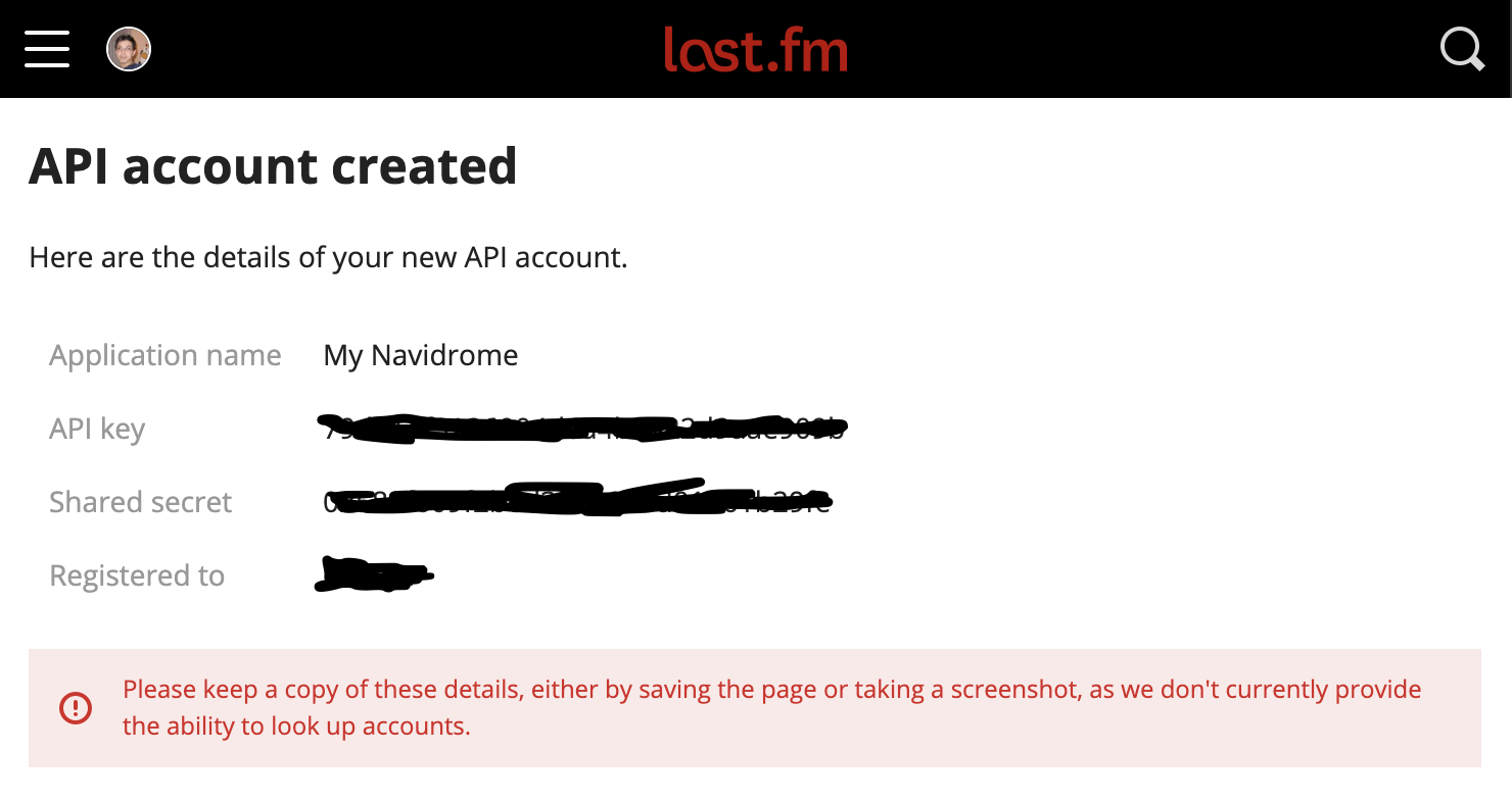 Navidrome can use Last.fm to retrieve artists biographies, top songs, similar artists and album covers. It can also send your scrobbles to Last.fm. For these features to work, you’ll need to set the config options LastFM.ApiKey and LastFM.Secret. You can obtain these values by creating a free API account in Last.fm: